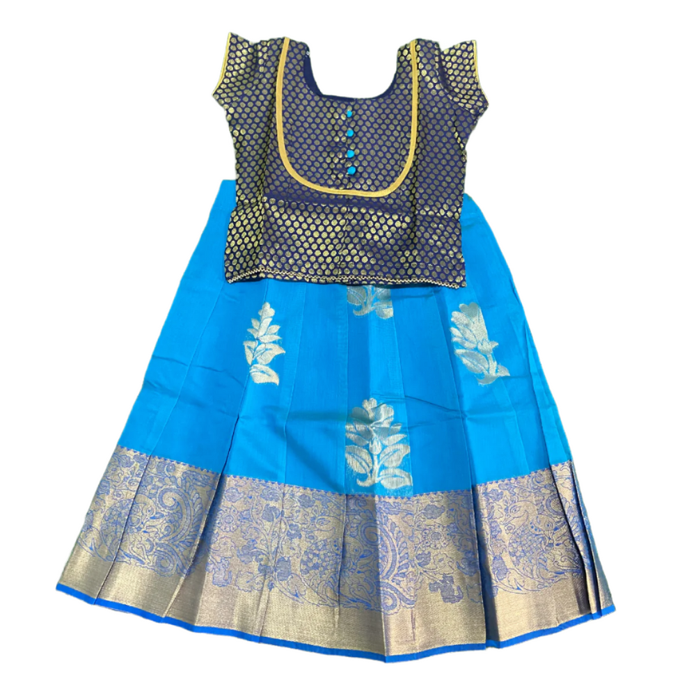 Kids Silk Cotton Pavadai Sattai Sky Blue and Navy Blue with Mango Zari Design
