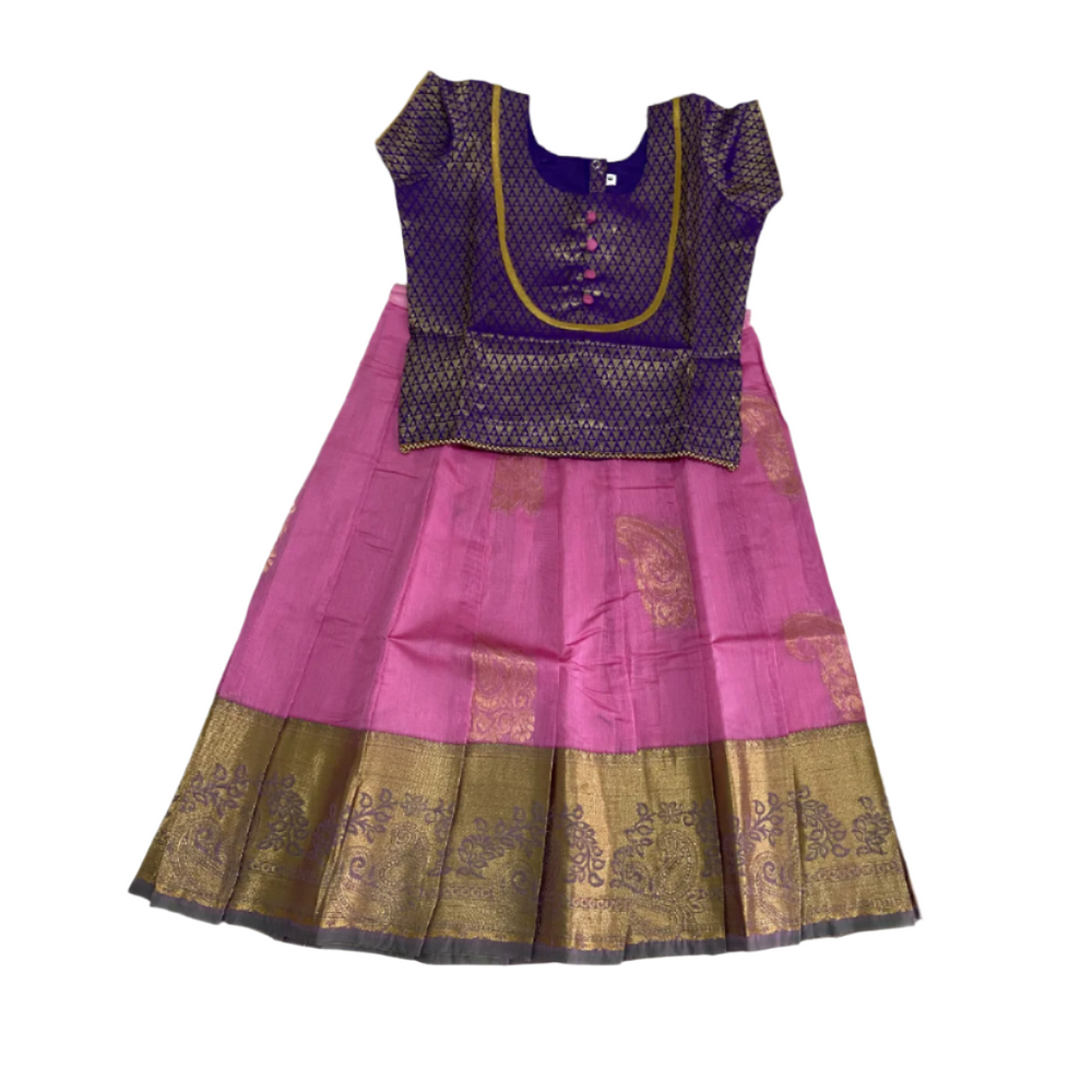 Kids Silk Cotton Pavadai Sattai Baby Pink and Violet with Mango Zari Work