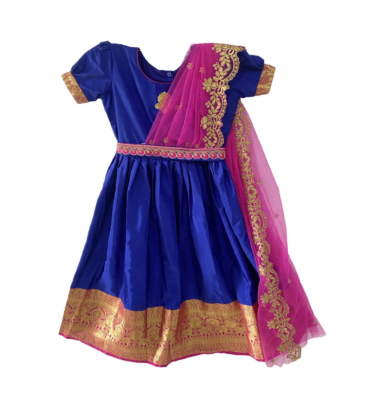 Kids Pattu Long Gown Blue and Pink – Traditional Silk Gown for Girls