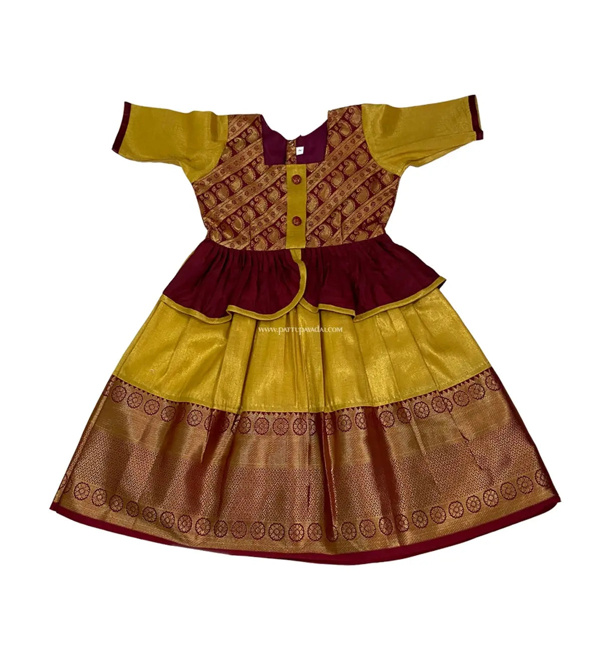The Kids Silk Long Gown in Golden and Maroon is made from lightweight silk fabric that carries a gentle traditional sheen. The golden base paired with maroon gives a rich, festive color contrast suitable for traditional celebrations. A soft cotton lining is stitched inside to keep the outfit breathable and gentle on the skin, supporting long hours of comfortable wear. This gown is suitable for festivals, family functions, temple occasions, weddings, and special celebrations where a traditional outfit with a neat finish is preferred.