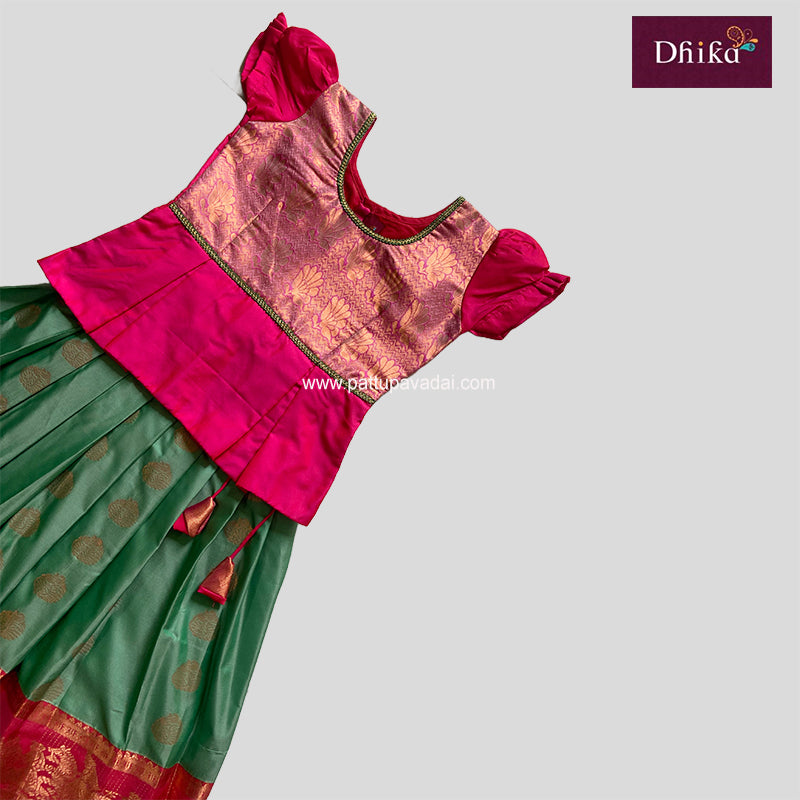 Kids Semi Kanchi Pattu Pavadai – Pastel Green & Pink Traditional Dress for Girls