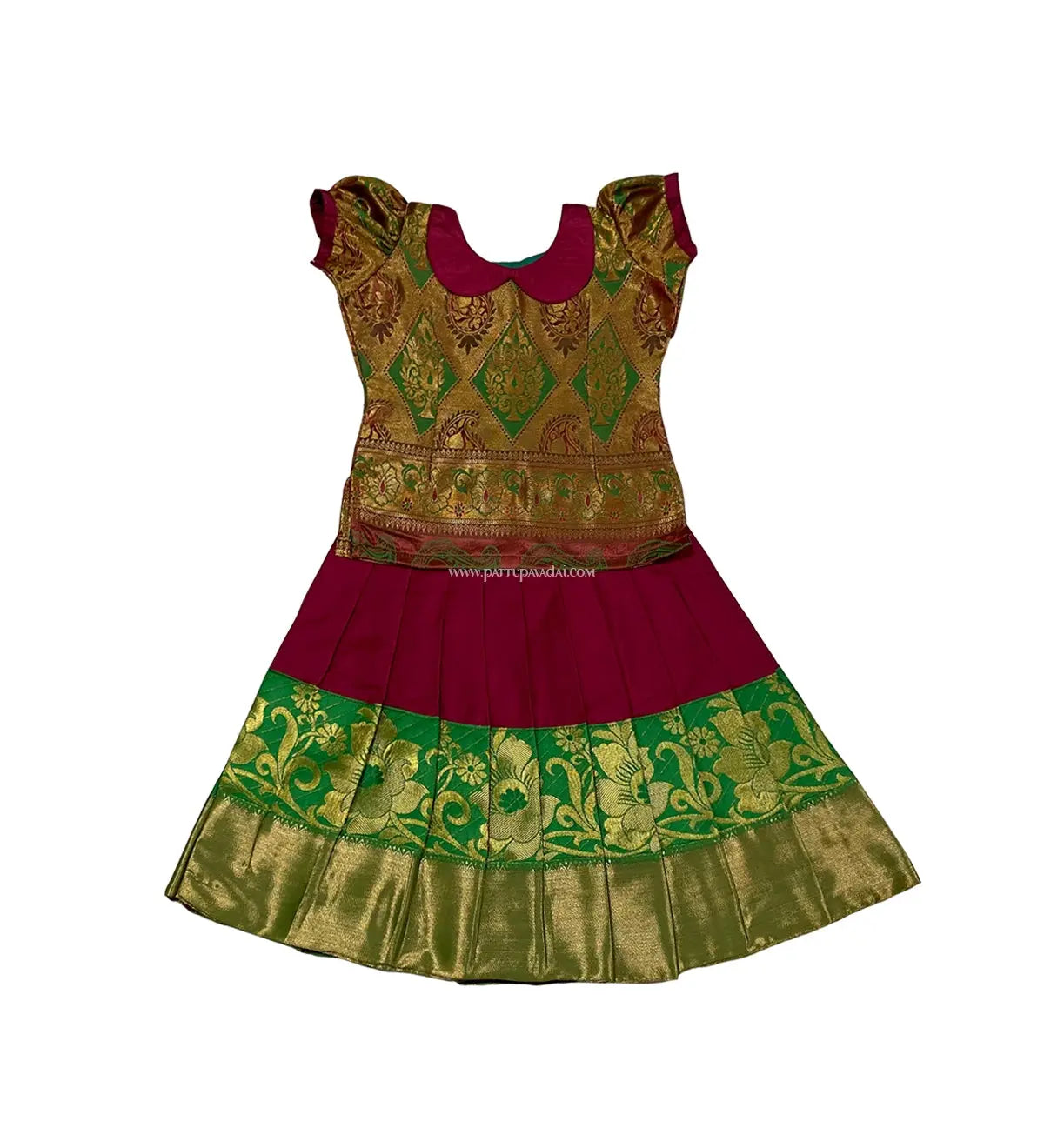Traditional Silk Pavadai Green and Red – Zari Work Blouse and Flared Skirt Set for Kids