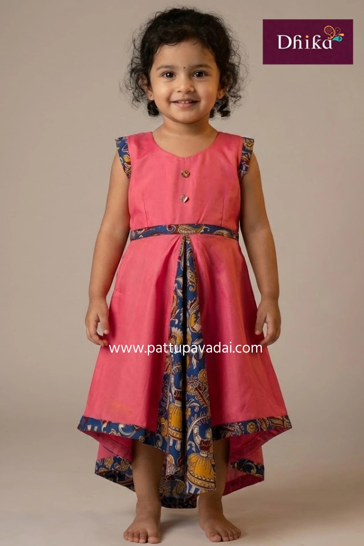 Pink and Blue Cotton Frock – Kalamkari Front Design for Kids