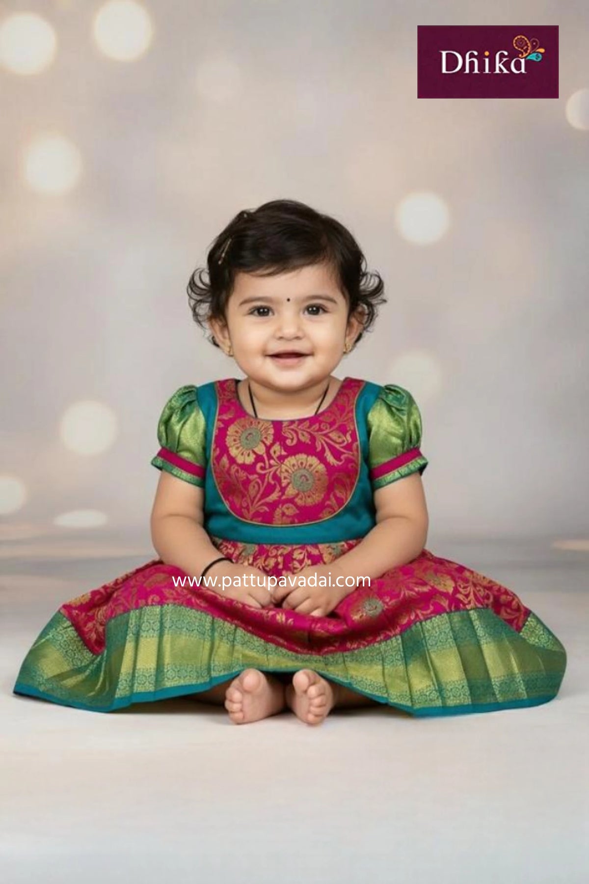 Pure Silk Frock – Pink & Rama Green | Kanchipuram Silk Party Wear for Baby Girls