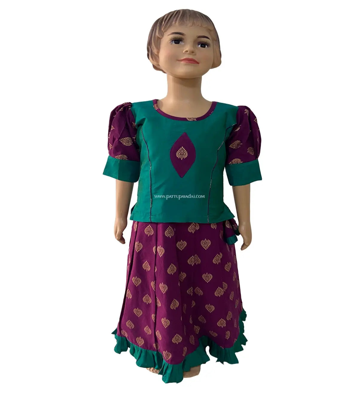 Kids Silk Cotton Top Green with Magenta Skirt – Traditional Puff Sleeve Skirt Set for Girls